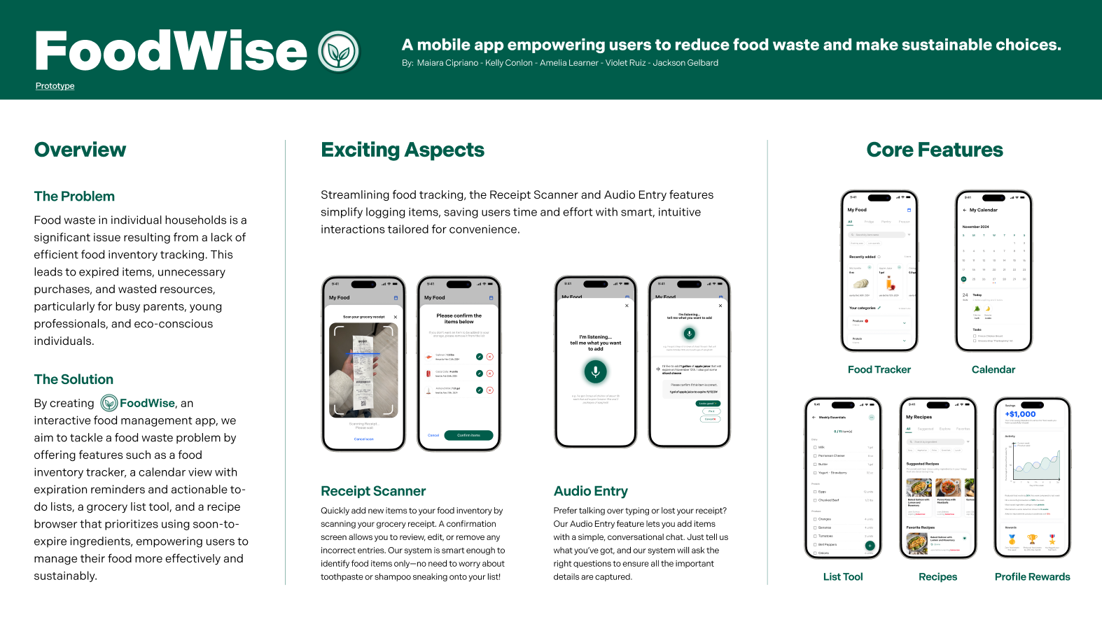 Our design rationale for FoodWise centers on reducing household food waste by addressing key user needs identified through research, such as ingredient tracking, leftover management, and grocery shopping. We prioritized simplicity and motivation, using features like recipe suggestions to encourage utilizing soon-to-expire ingredients, a waste tracker with a calendar feature to visualize when items are expiring, and a list page to reduce overbuying. All of these key features aim to empower users to manage their food more effectively and sustainably. Along with this, we incorporated visual graphs and rewards to promote sustainable habits. Our clean, intuitive design, supported by a welcoming and eco-friendly color palette and accessible typography, ensures an engaging and user-friendly experience for all individuals.