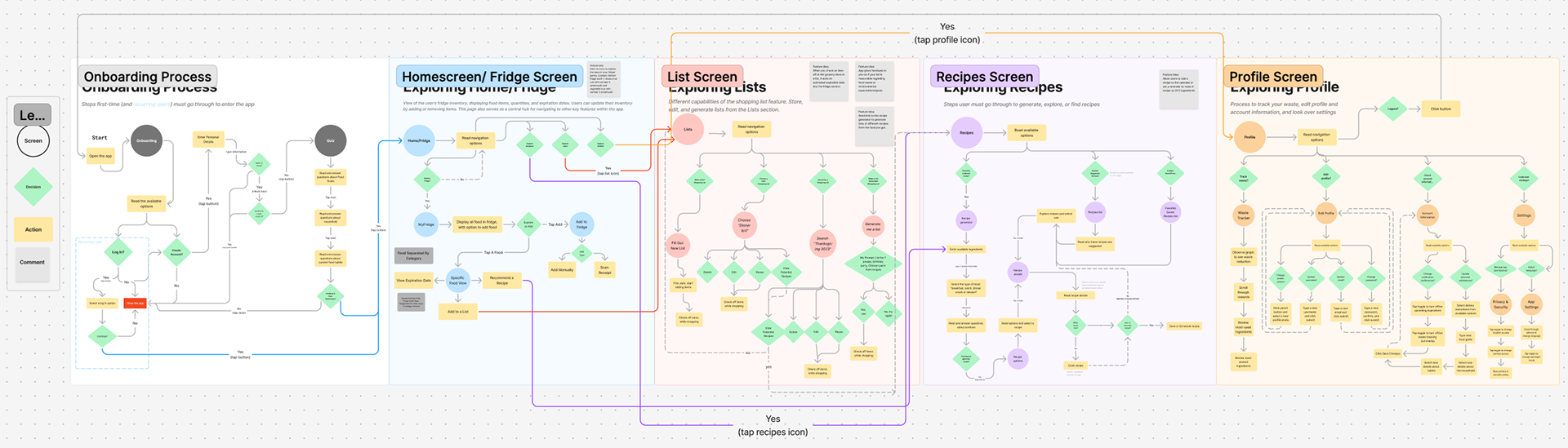 Created a comprehensive user flow diagram to map the user journey through the app. This diagram clarified our navigation when beginning to design and prototype to ensure intuitive design.