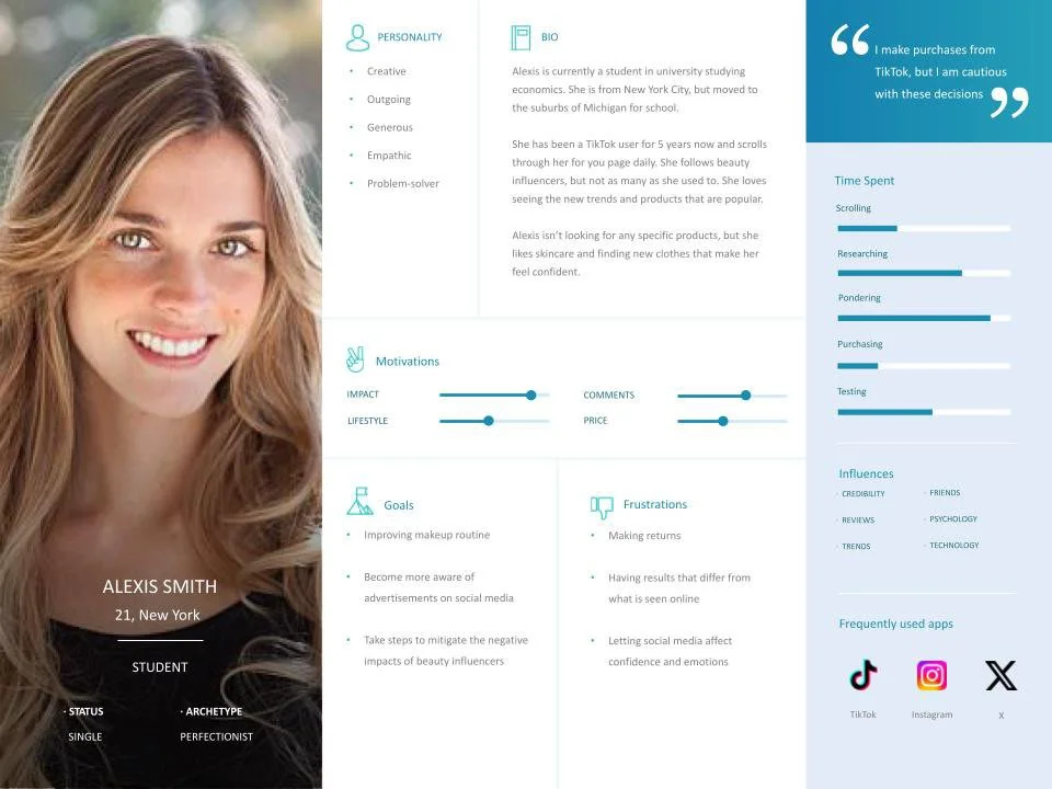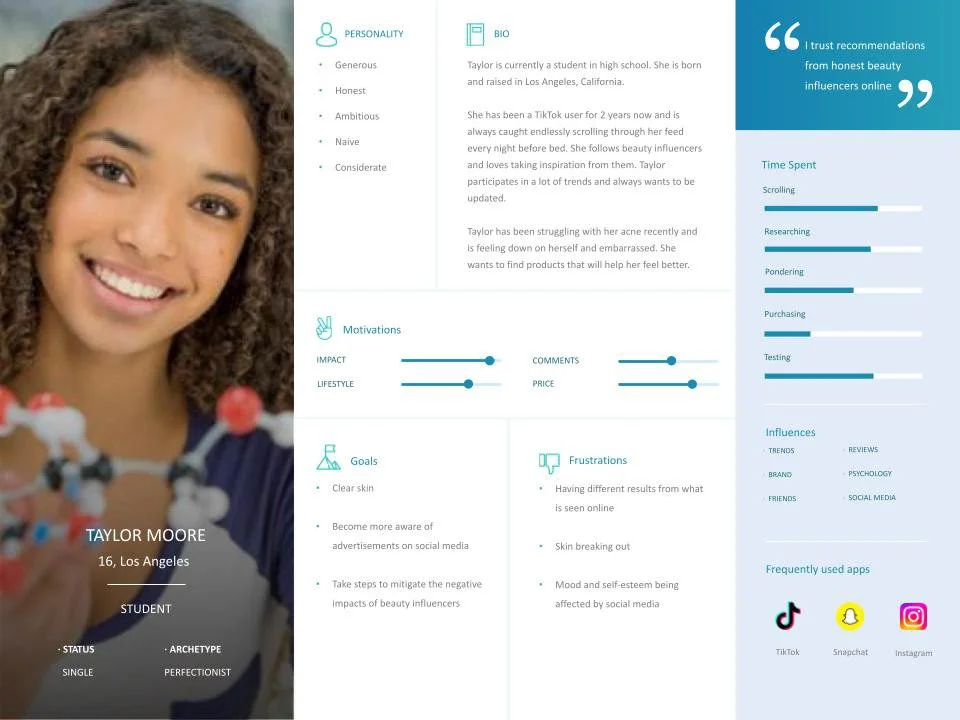 Created two personas to represent the various experiences of my participants. Older women in the 16-24 age range tended to be more secure online and sure with themselves compared to the younger women. They also were less likely to be influenced and had more positive experiences on TikTok. All of the details in my personas were pulled from responses of my participants and by making two separate ones for the younger and older women, I covered a majority of the experiences discussed.